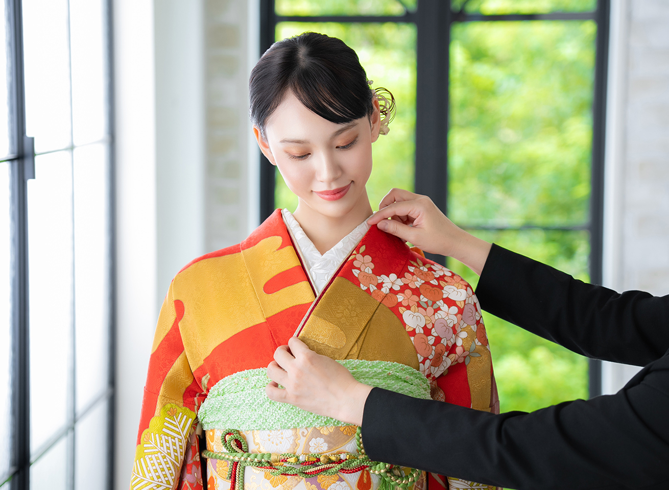 経験豊富な着付け師が、お一人おひとりの体型やお召し物に合わせ、細部にまで心を配りながら丁寧に着付けを行っております。